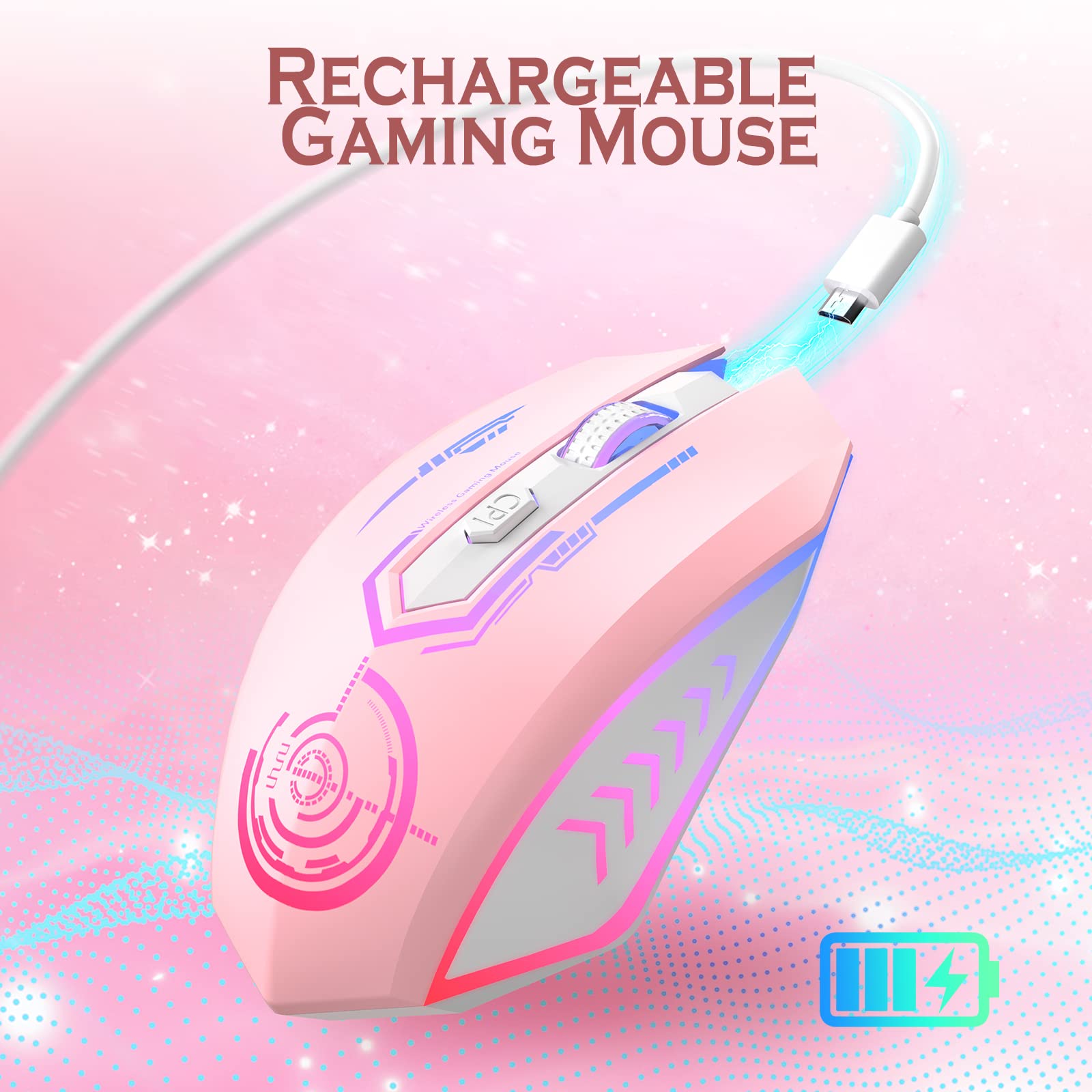 - POWERFUL BATTERY LIFE - The rechargeable mouse has a long battery life between 60 hours (RGB on) and 80 hours (RGB off) on a single charge, providing you with nonstopping use. It will auto-sleep after 8 minute of inactivity for power saving. Any click will wake up this mouse. The wireless mouse gaming also can be used while charging (Note: It can only be used while charging when the nano receiver is inserted into your laptop)